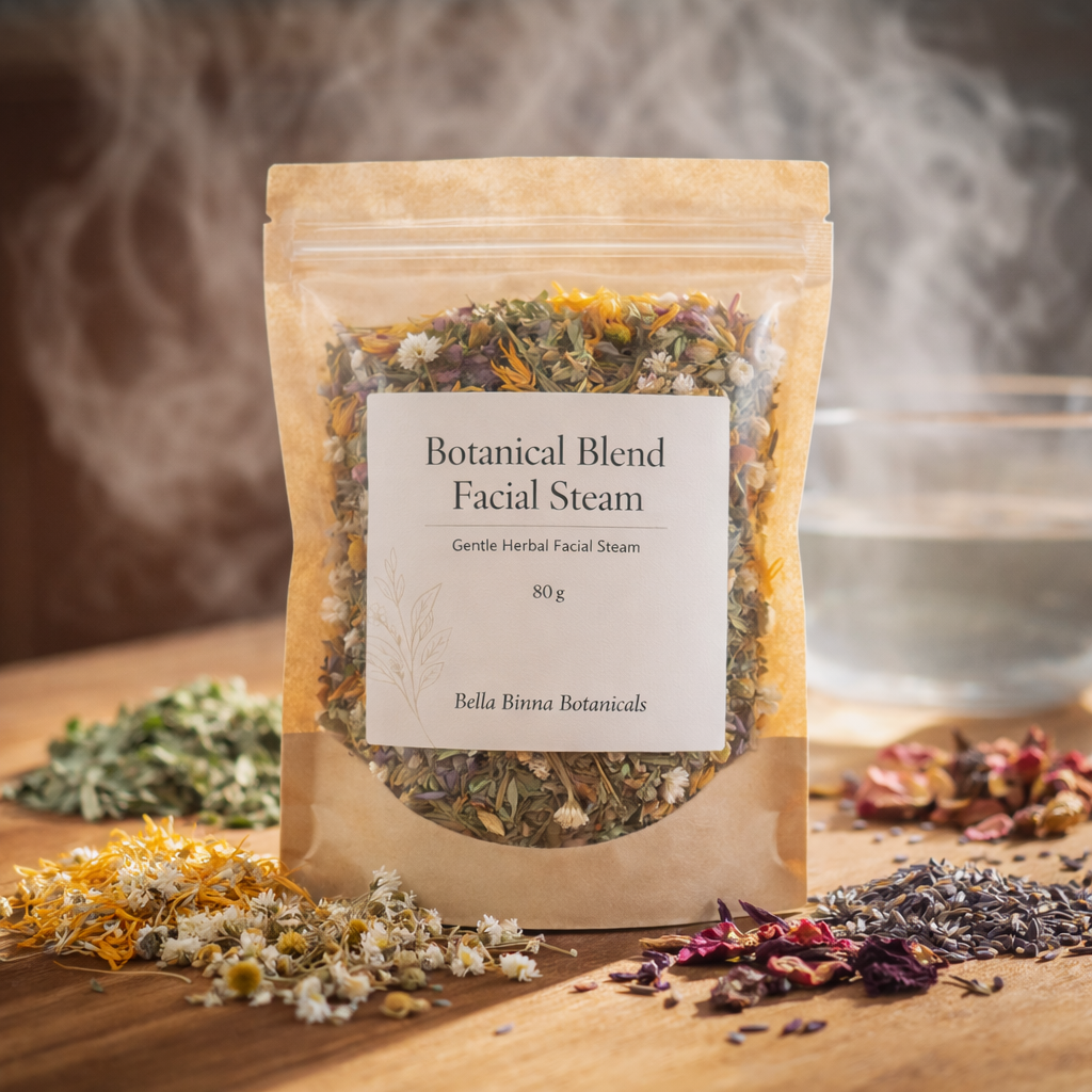 Traditionally used in herbal skincare rituals, facial steaming helps encourage circulation and relaxation while allowing botanicals to release their natural aromas and properties. This blend is intentionally formulated to be calming, supportive, and suitable for regular self-care practices.