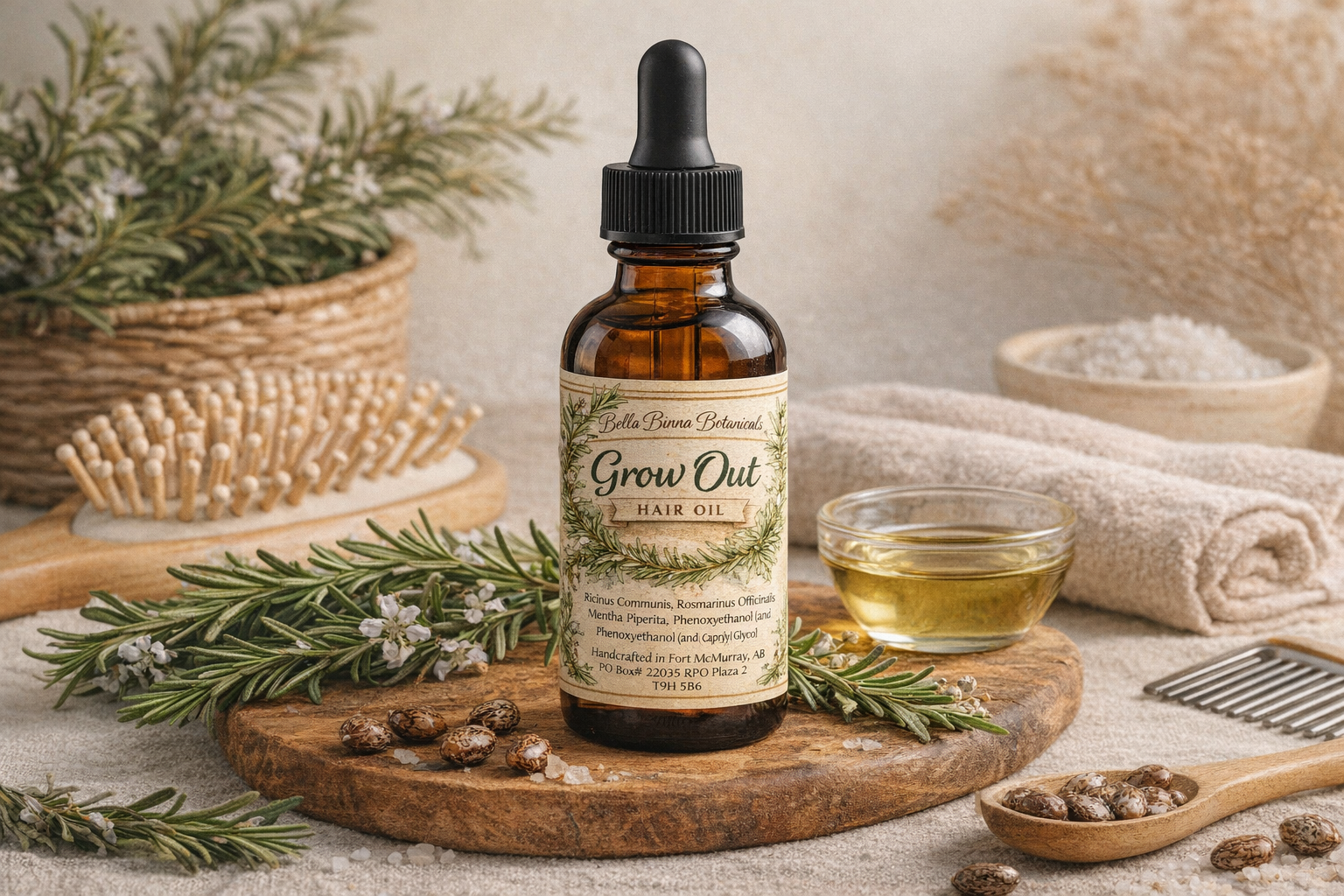 This formula begins with slow-infused castor oil, carefully infused over time with rosemary and peppermint grown in our garden. Slow infusion allows the botanical properties of these herbs to gently release into the oil, creating a rich, nutrient-dense treatment that supports scalp circulation, strength, and shine.